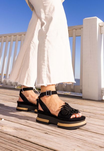 This leather sandal has a round toe, memory foam insole, leather lining and synthetic outsole. This style also features a hook and loop closure on a 1.75 inch heel.