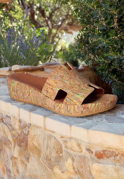 This cork sandal has a memory foam insole, leather lining and synthetic outsole. This slip on shoe is on a 1.75 inch heel.