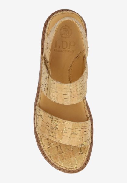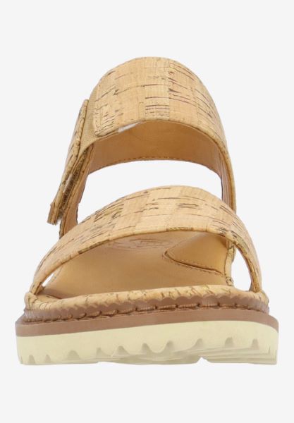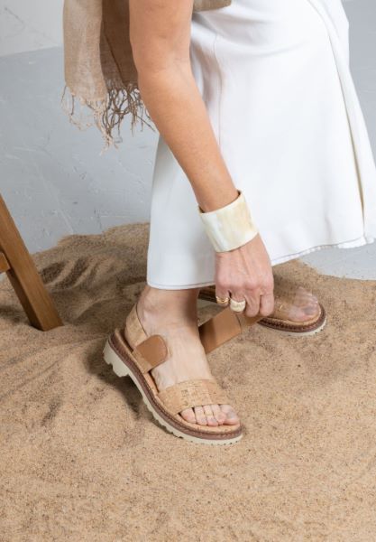 This cork sandal has a round toe, memory foam insole, leather lining and synthetic outsole. This style also features a hook and loop closure on a 1.5 inch heel.